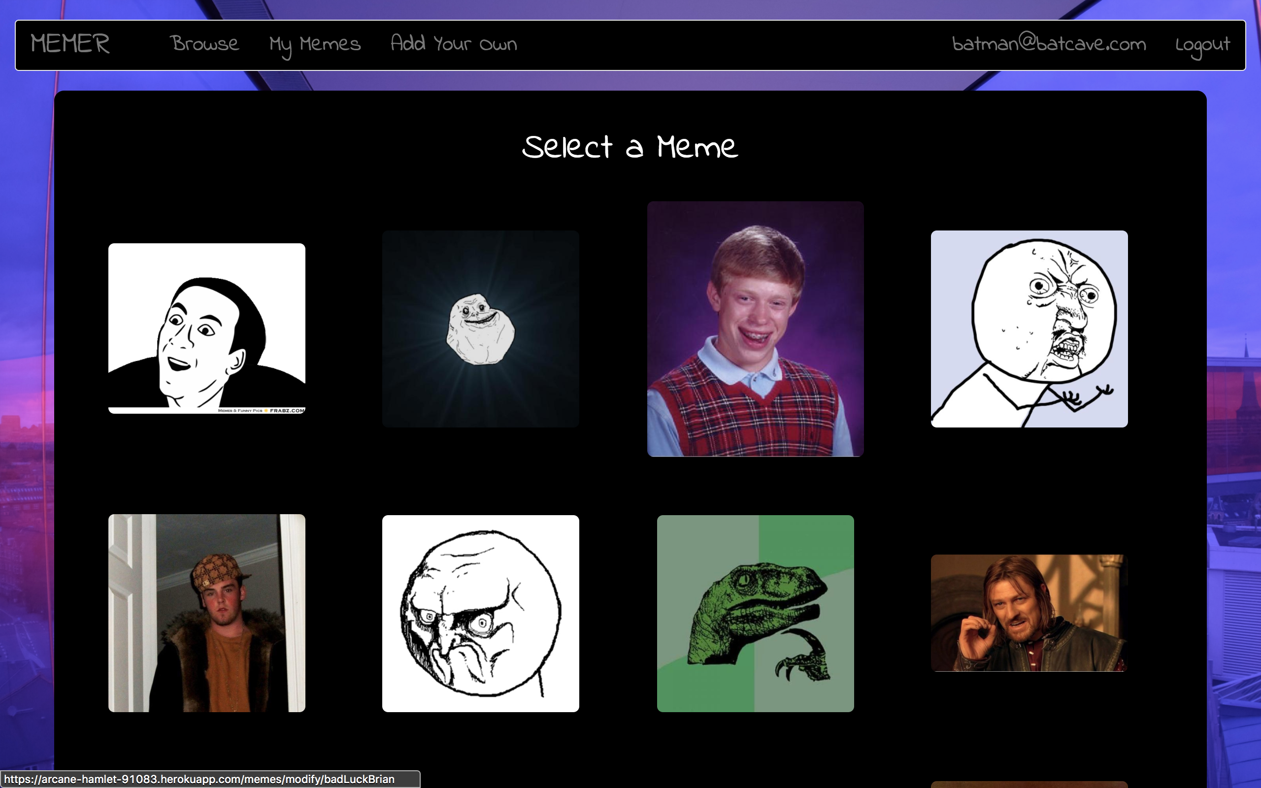 Memer is an app that I created myself useing MEN stack (MongoDb, Mongoose, Express, and NodeJS)and it's purpose was simple: Make an application that can take some of my all time favorite memes and make them into my own!